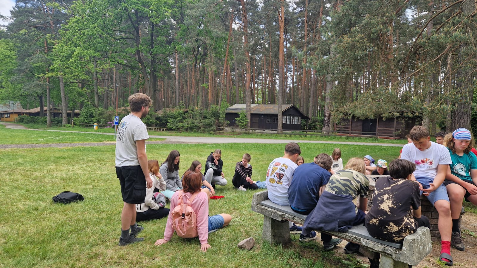 ...po první noci v chatičkách jsme se probudili do relativně slunného dne. Po snídani formou švédského stolu měla žlutá třída čas připravit si svůj dopolední program a ostatní se zatím věnovali rozličným činnostem: někdo hrál deskovky či jiné společenské hry, někdo fotbal, někdo na kytaru a někdo si třeba povídal nebo četl. Když se vrátila skupinka, která v blízkém okolí chystala 2km trasu orientačního běhu, sesedli jsme se do kolečka a zjistili, kdo všechno se chce běhu zúčastnit. Běžci se pak došli nachystat, rozdělili se do dvojic, trojic nebo čtveřic a přesunuli se na start. Po pětiminutových intervalech skupinky mohly vyrážet. Na trase běžce čekal jeden úkol, pár kopců, jedny strmé schody a první tři skupinky také malé překvapení v podobě otočených šipek, které značily trasu. Naštěstí je jeden z organizátorů pro ostatní skupinky otočil zpět do správného směru. Nejlepší čas měla dvojice tvořená Prokopem a Honzou s devíti minutami a čtyřiceti pěti vteřinami.